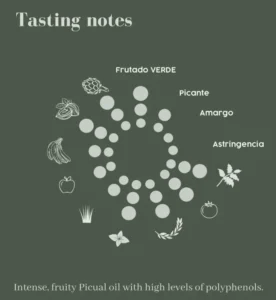 Intense green fruit flavours and artichoke, and spicyness due to high amout of polyphenols